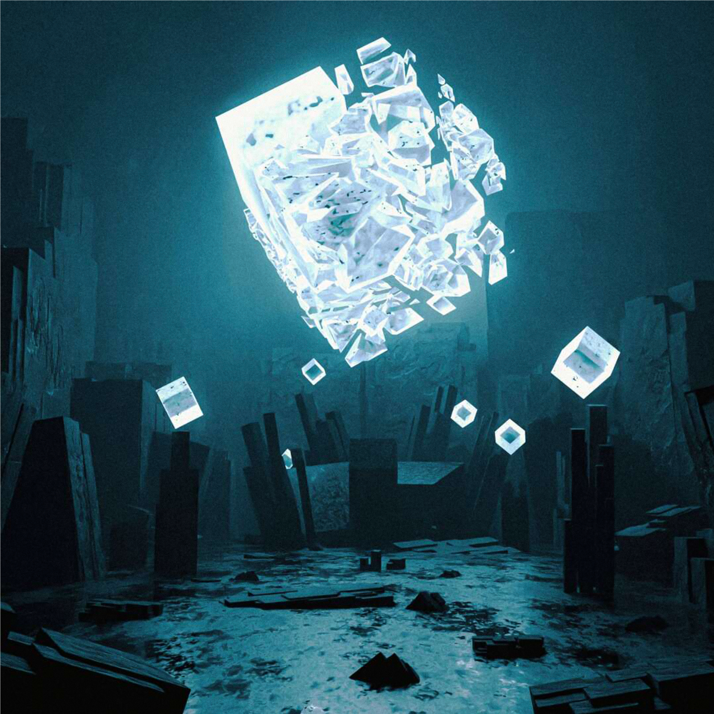 Premade album art of a futuristic scene with glowing, floating, geometric shapes in a dark, desolate setting.