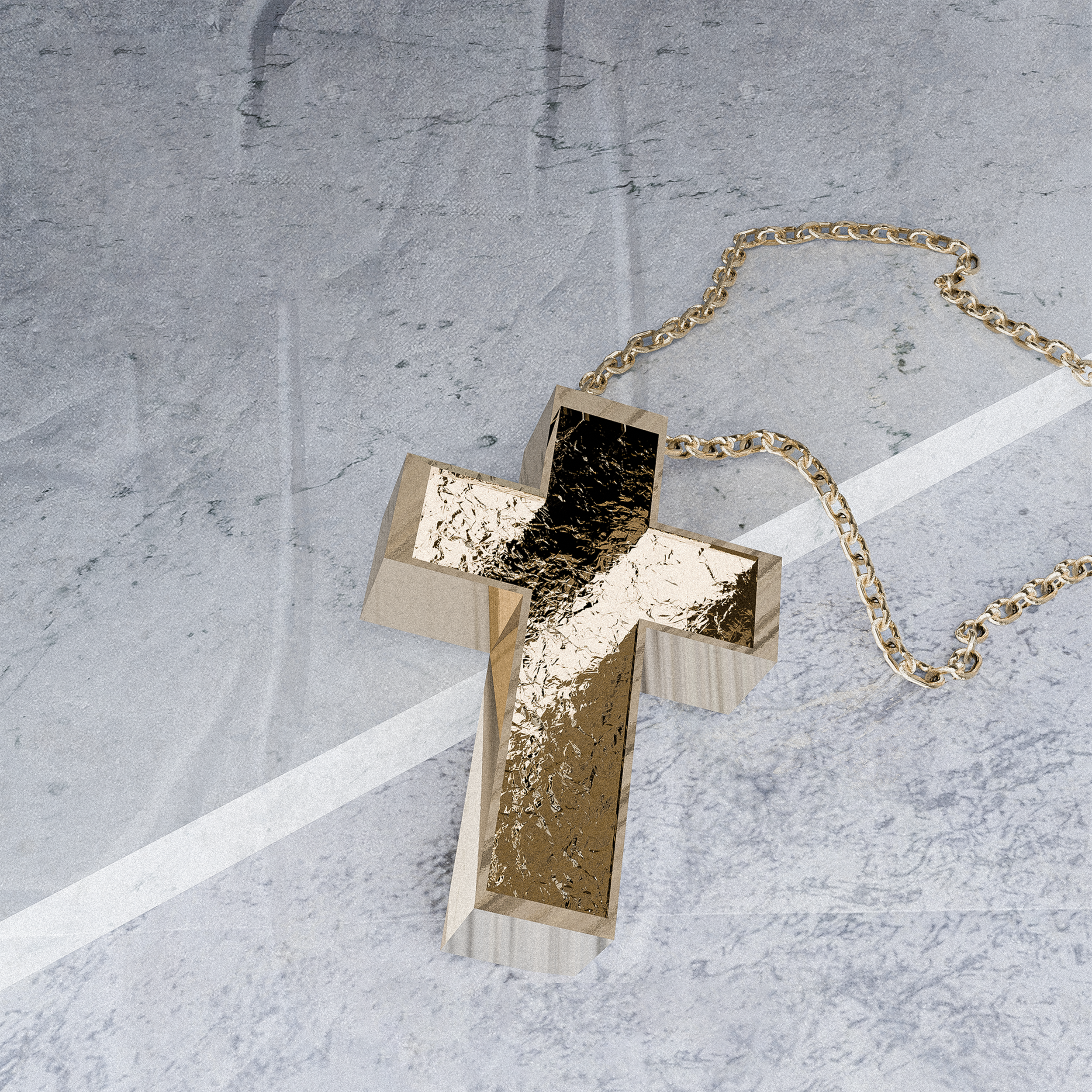A gold cross pendant with a textured surface, attached to a gold chain, resting on a marble surface.