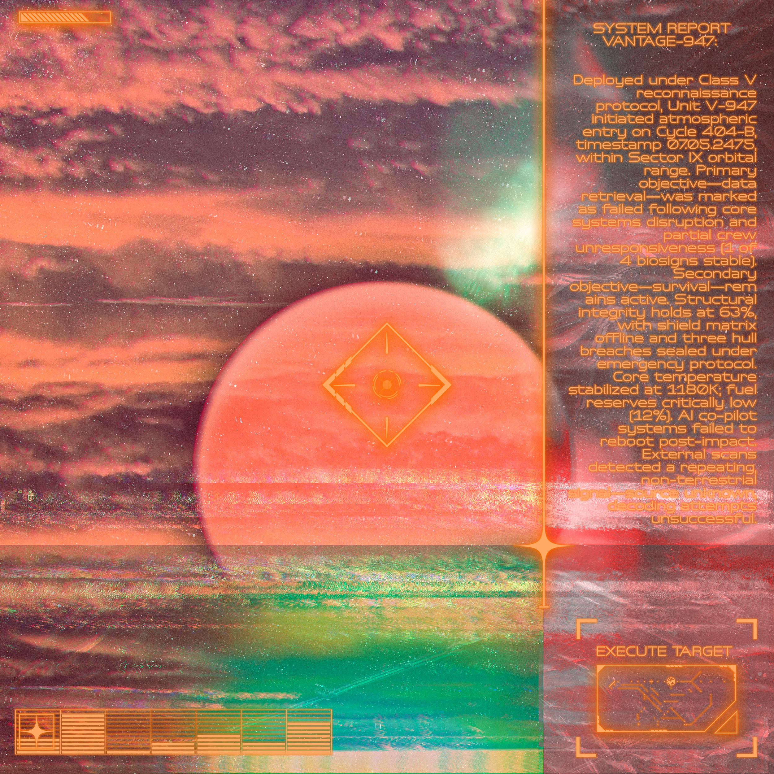 Futuristic digital interface overlay on a landscape view of a large, glowing planet with a sunset-like sky, featuring system report text and targeting graphics in orange.